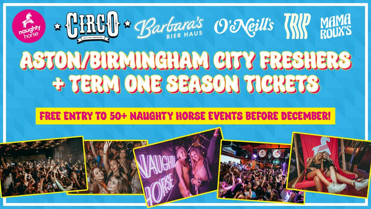 Aston/Birmingham City Freshers + Term 1 Season TicketsA Very Quick Explanation ... Your Naughty Horse Season Ticket = Entry To The Biggest Freshers Events + Entry to all our weekly events before Christmas. xDisclaimer this is not valid for university of birmingham students you must buy the UOB season ticket.