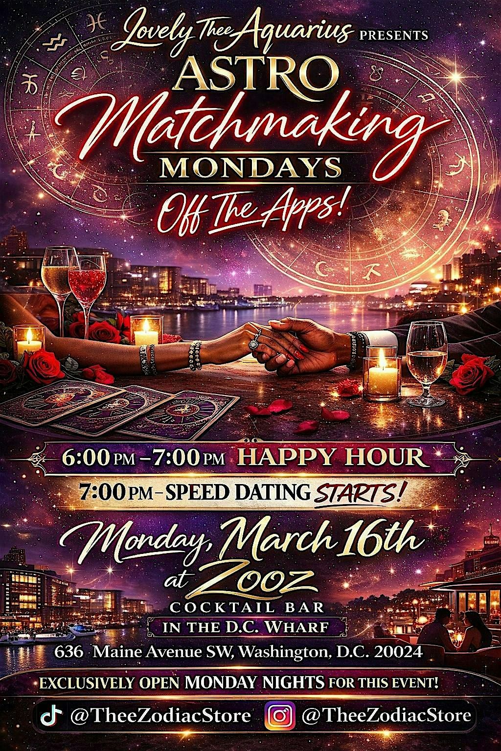 Mondays is every Monday at Zooz Cocktail Garden. The restaurant is open exclusively for this event. Come on out and enjoy a great happy hour and make some cosmic connections. The event is led by actual astrology compatibility, readers and birth chart specialists. Every week the event will be different. This week March 23rd event is speed dating so dress to impress, make sure your breath is fresh and potentially meet some new friends or new a forever! Tell friend to tell a friend. I'll see y'all on Mondays. PS. If you are remotely into astrology, zodiac signs, or you will have a great time at this event.