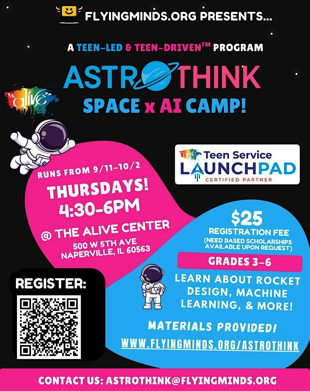 AstroThink, a nonprofit led by high-achieving high schoolers that teaches hands-on STEM activities in Space and AI for grades 3-6! Students will learn about rocket design, machine learning, programming in HTML/CSS, and more!