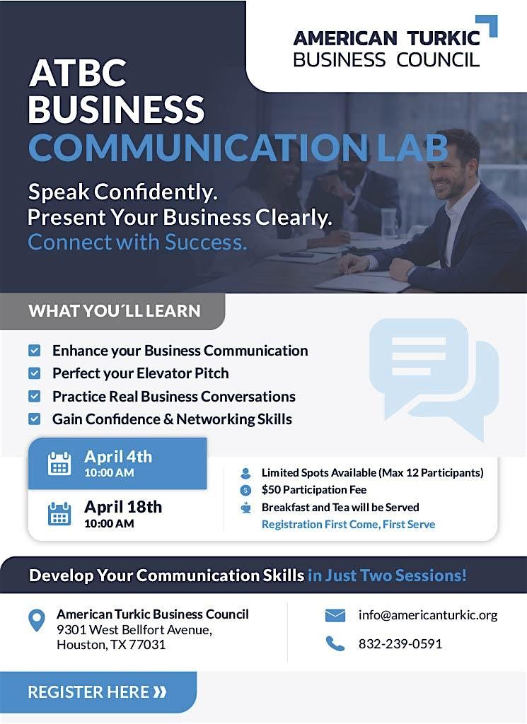 Join the American Turkic Business Council (ATBC) for an interactive Business Communication Lab designed to help you communicate effectively in professional settings.