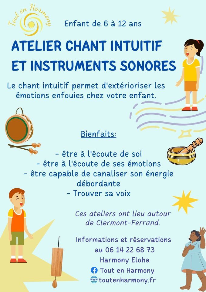 Atelier inédit spécialement conçu pour vos enfants afin qu'ils puissent s'exprimer pleinement par le chant intuitif !Adieu les conventions, place au lâcher prise mental !