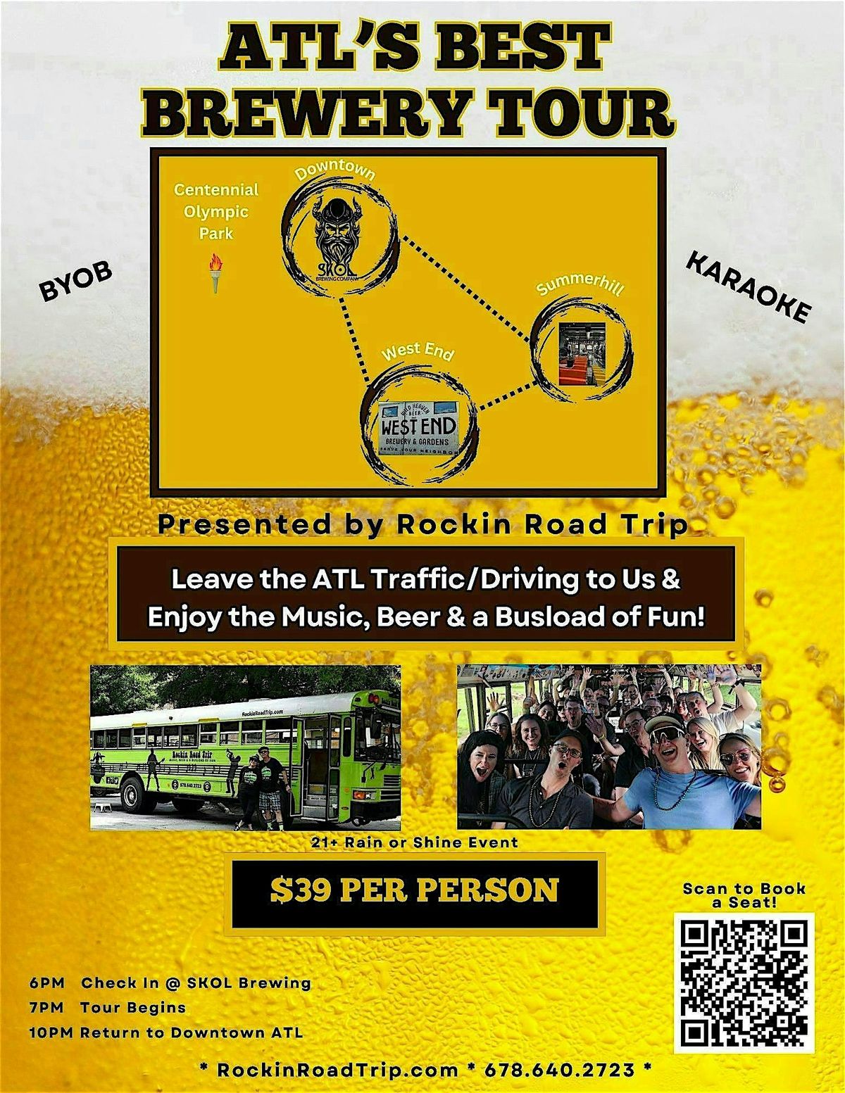 The Rockin Road Trip Party Bus will arrive @ 6:45 to pick you up at SKOL Brewing at 155 Carnegie Way N.W. in ATL, GA 30303. Why not get there early & have a bite or a drink or two? We would hate to leave you so PLEASE DON'T BE LATE because we leave @ 7PM SHARP & all other times on the agenda are approximate.