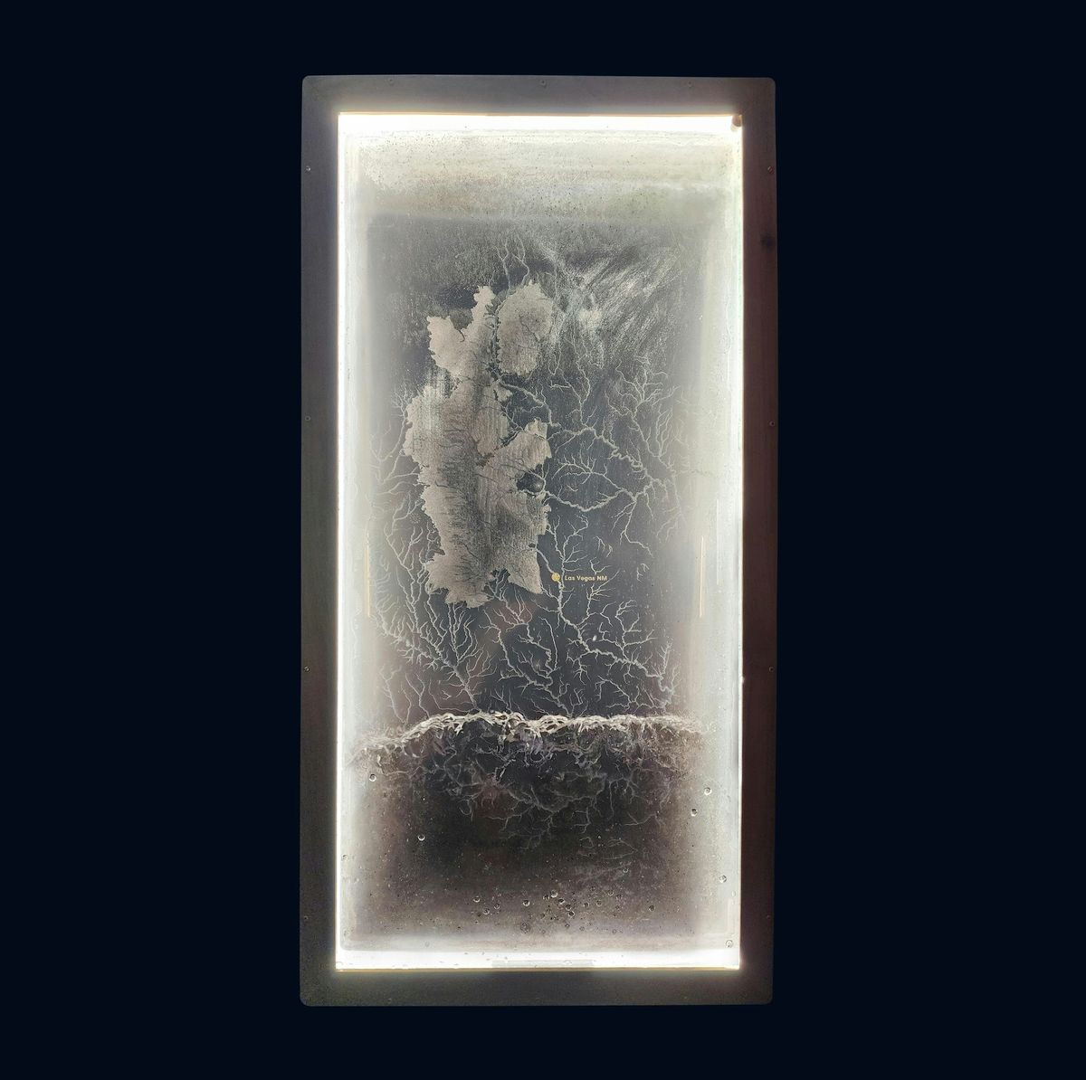 Artist Jessica Lanham's interactive water sculpture is based on the concept of turbidity. Viewers push down on a seesaw mechanism to activate turbid water containing sediment and ash, which then washes over a laser-etched map of the Gallinas, Mora, Sapello, and Pecos watersheds.