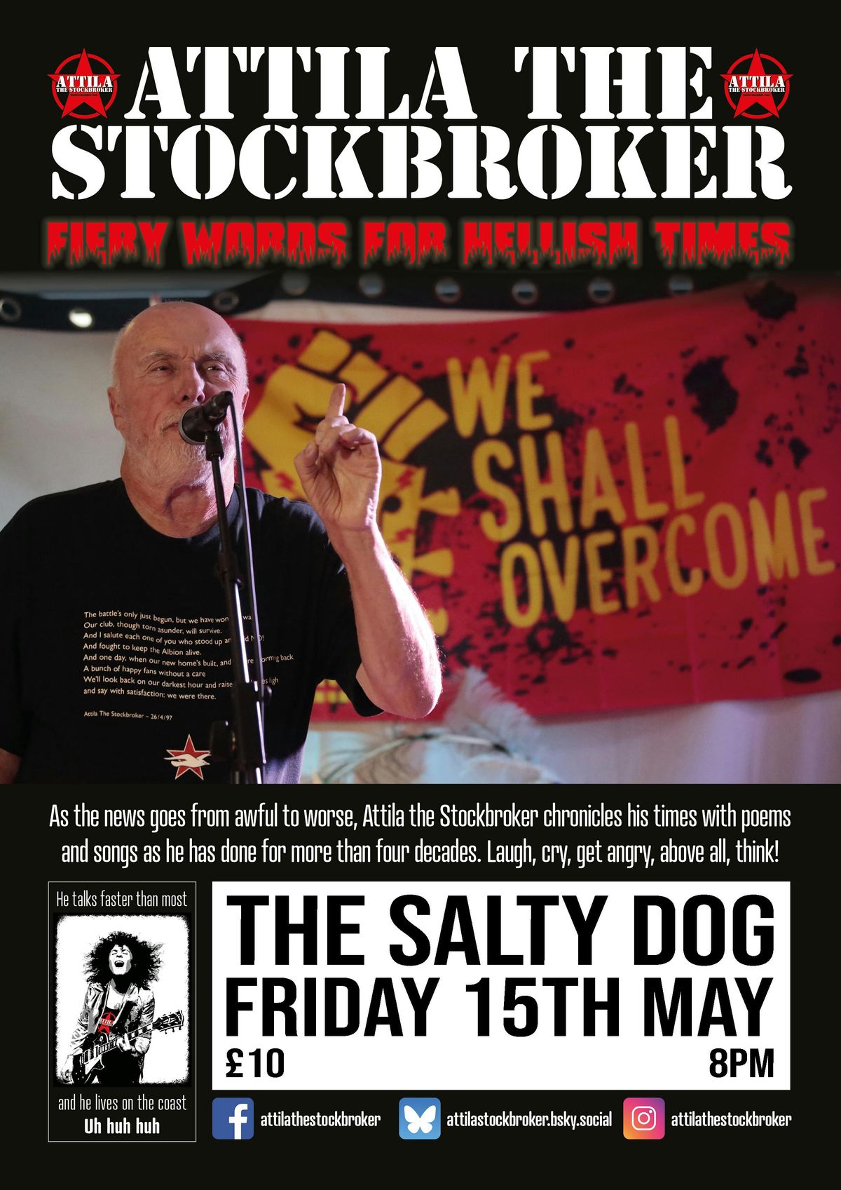 Punk poet, latterly dub poet, singer-songwriter and multi-instrumentalist Attila the Stockbroker exploded into public consciousness in 1982-3 via two John Peel sessions and a Melody Maker front cover and is now celebrating 44 years earning a living doing what he loves. So far: 4000 gigs in 24 countries, some 20 CD/s LPs, eight books of poems, his autobiography ‘Arguments Yard’.Attila’s current solo performance comprises fiery, satirical, political and personal spoken word, dub poetry, acoustic songs and early music punk on ancient instruments. He really doesn’t sound like anything else. He’s very prolific and his material is very, very up to date. Last year he did a 14 day run at the Edinburgh PBH Free Fringe called ’14 Days, 14 Completely Different Shows’.