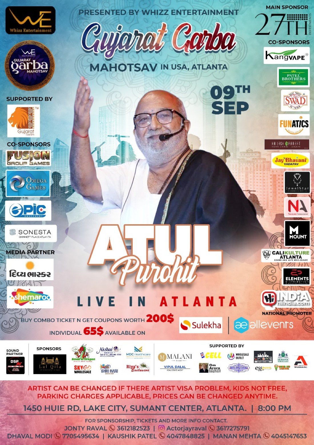 Whizz Entertainment presents "Gujarat Garba Mahotsav 2023- Atlanta" with Well-known artist "Atul Purohit" Live in Atlanta 2023.