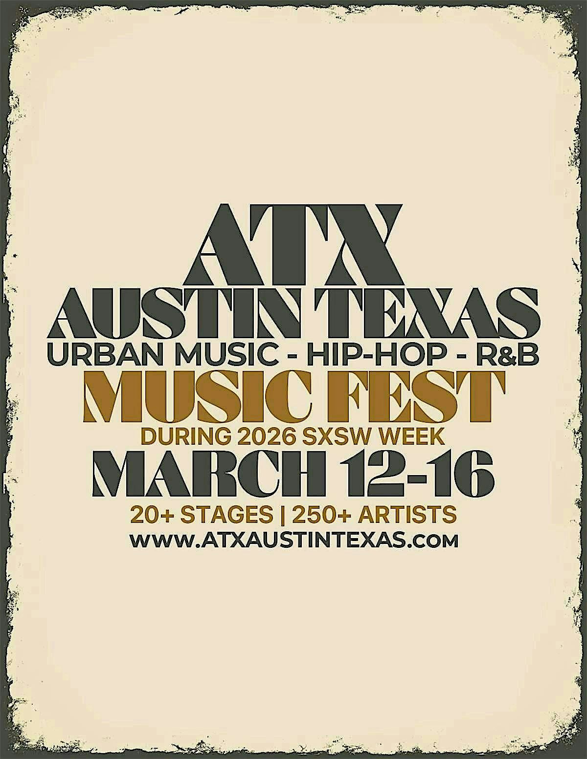 ATX Austin Texas Music Fest is a curated live music festival happening in Austin Texas during SXSW Week in March 2026. It brings together multiple performance stages and music showcases featuring emerging and established artists across genres, with a strong focus on Hip Hop, RnB, urban, and local culture driven programming.