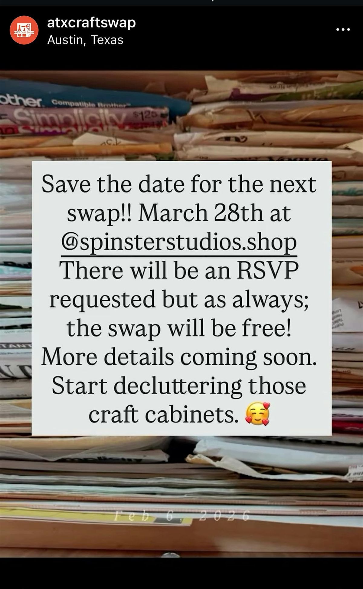 Hey Austin creatives! Join us for the ATX Craft Swap, an awesome in-person meetup where you can trade your unwanted craft supplies, share crafty tips, and connect with fellow makers. Whether you’re into knitting, painting, or DIY crafts, this is the perfect spot to find fresh inspiration and maybe snag a new hobby. Don’t miss out on the fun, friendly vibes, and some serious maker magic! This months swap is kindly hosted at SpinsterStudios.