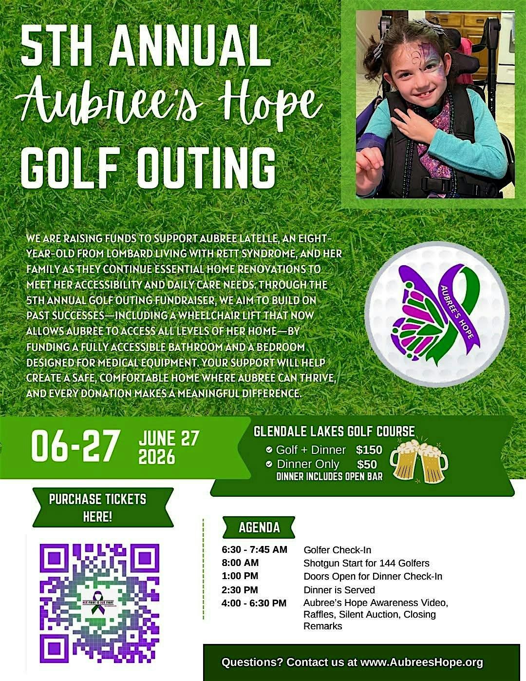 In efforts to help Aubree's family cover their expenses as they continue to renovate their home to meet her accessibility and daily care needs - and in addition to a wheelchair lift that now allows Aubree access to all level of her home - proceeds will help fund a fully accessible bathroom and bedroom designed for medical equipment. Please consider attending our Golf Outing and Dinner Fundraiser!