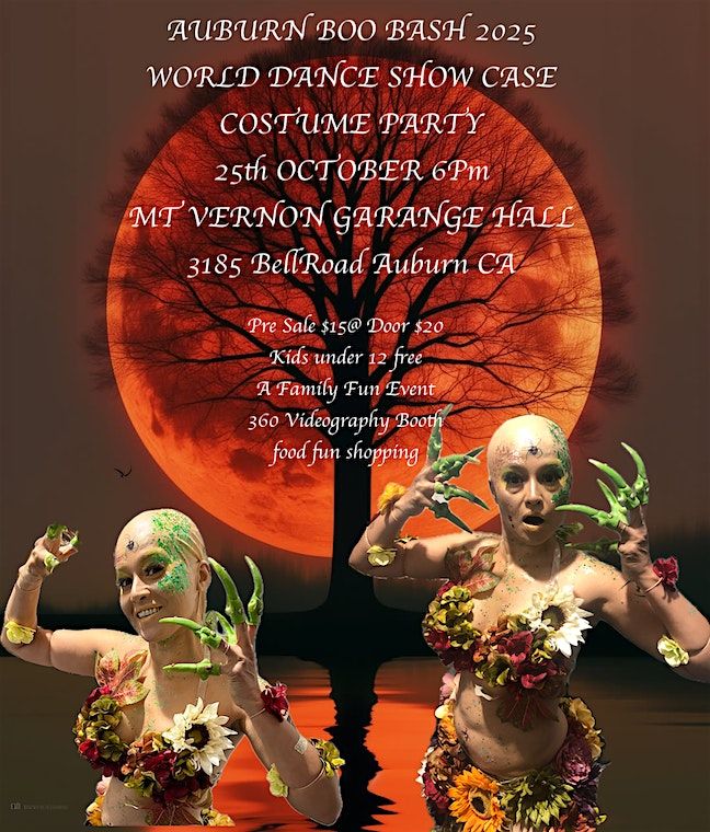 Welcome to the Auburn BOO Bash 2025! Get ready for a spooktacular evening at Mt Vernon Grange on October 25, 2025 at 6:00 PM (Pacific Time). Join us for a night of frightful fun, WORLD DANCE SHOW CASE famous belly dance performers from Gold Country ,Sacramento and Bay area ,costume party,360 Videography Booth,Raffle Tickets,Shopping,(Food and beverages will be avaiable to purchase at Venue), after Show Case dance on your favorite Halloween tunes. Don't miss out on the Halloween excitement! Come with your best costume and be prepared for a BOO-tiful time!