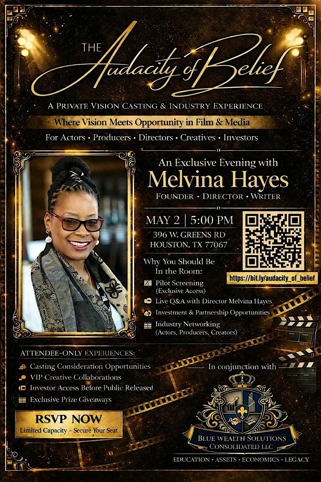 Join us for an unforgettable experience featuring Melvina Hayes, an accomplished Founder, Director, and Writer, as she opens the door to insight, access, and industry connection.