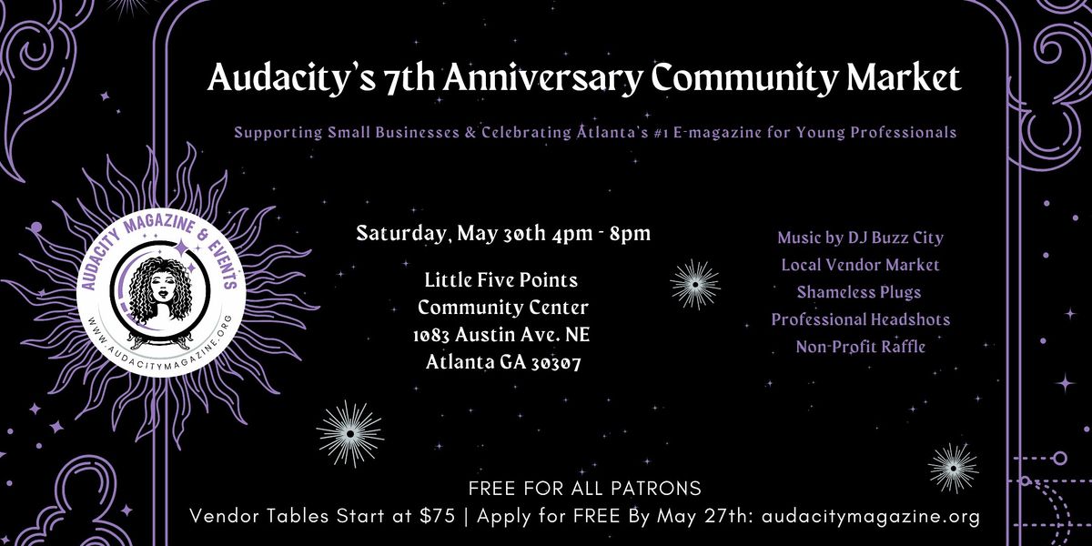 Audacity Magazine & Events has spent the last seven years creating space and narratives for young professionals and small business owners. Join us at our community market to support small businesses in our backyard.