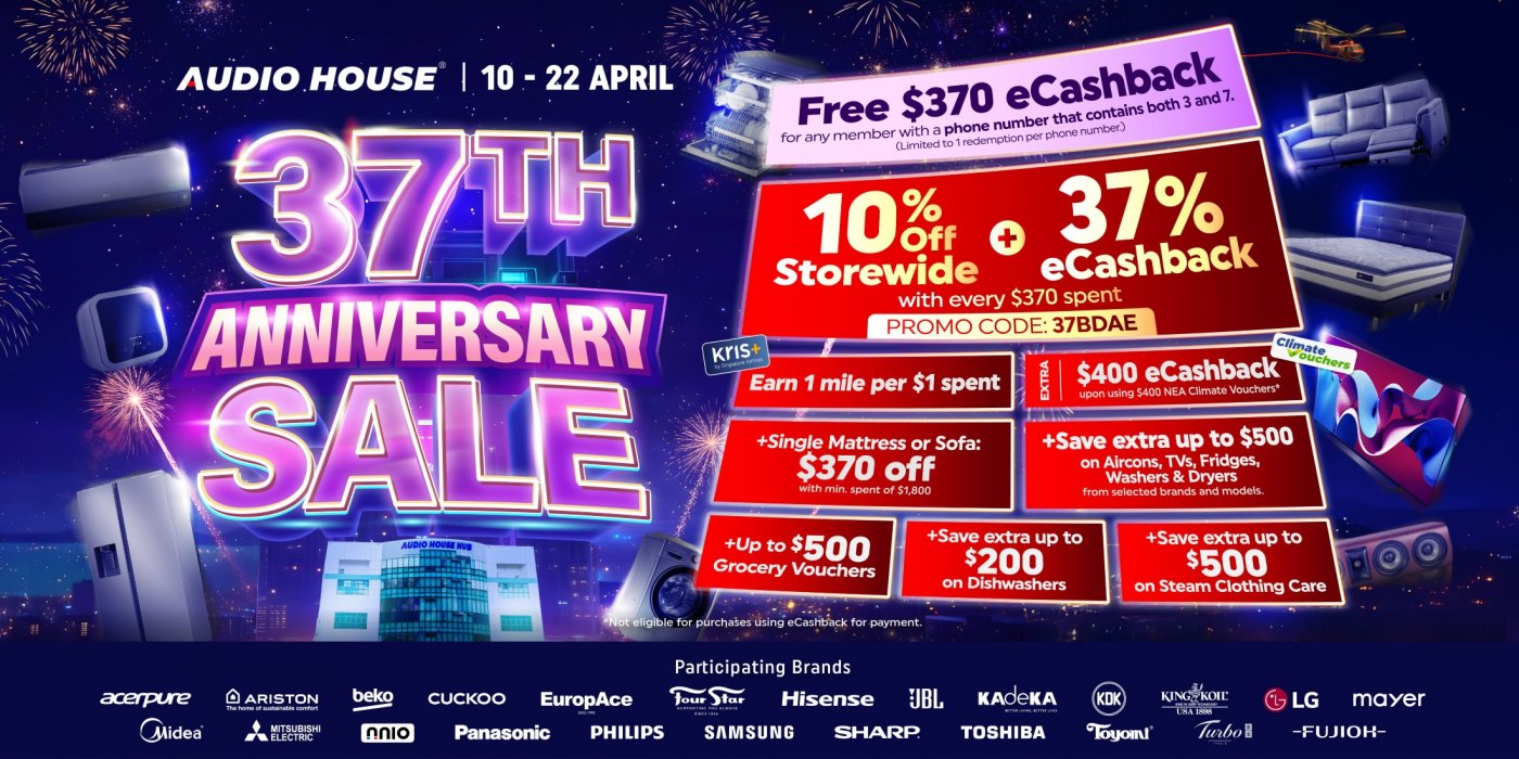 To mark their 37th anniversary, Audio House will be hosting a storewide sale from 10 to 22 April 2026, and offering FREE $370 in eCashback to all members — new or existing — whose mobile phone number contains both the digits "3" and "7". No minimum purchase is required for this redemption, limited to one redemption per member per phone number.