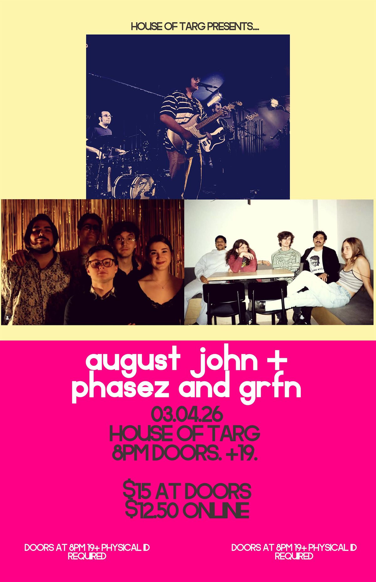 Rock out to Ottawa indie bands August John, Phasez, and GRFN all on the same bill! A night you don't want to miss!