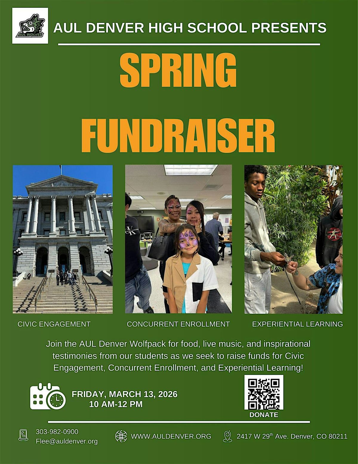 Greetings!Close your eyes, use your imagination, and visualize a place where a student once not succeeding in school, struggling at home, and overwhelmed with anger, transforms. Imagine that same student increasing their attendance, using art to express their emotions, and ultimately being celebrated at our school's "Los Lobos Awards" for achieving all A's.This is the transformative power of AUL Denver High School, a proven example of how a school can truly embrace the Whole School, Whole Community, Whole Child model every single day.We invite you to join us in celebrating the resilience and success of our students by becoming a table sponsor at AUL's Spring Fundraiser:Date: Friday, March 13, 2026Time: 10:00 AM - NoonLocation: AUL 2417 W 29th Ave, Denver, COYour support as a table sponsor will ensure that AUL continues to provide a safe, nurturing environment for students to thrive academically, socially, and emotionally. Delicious food, live music, and student-driven testimonies will be featured at this event!Reserve your table today and help us make a difference in the lives of students who need it most.Sign Up to Sponsor a TableThank you for believing in the potential of every student. Together, we can support academic success leading to brighter futures.Mr. Frank A. Lee, Jr.PrincipalAUL Denver High School