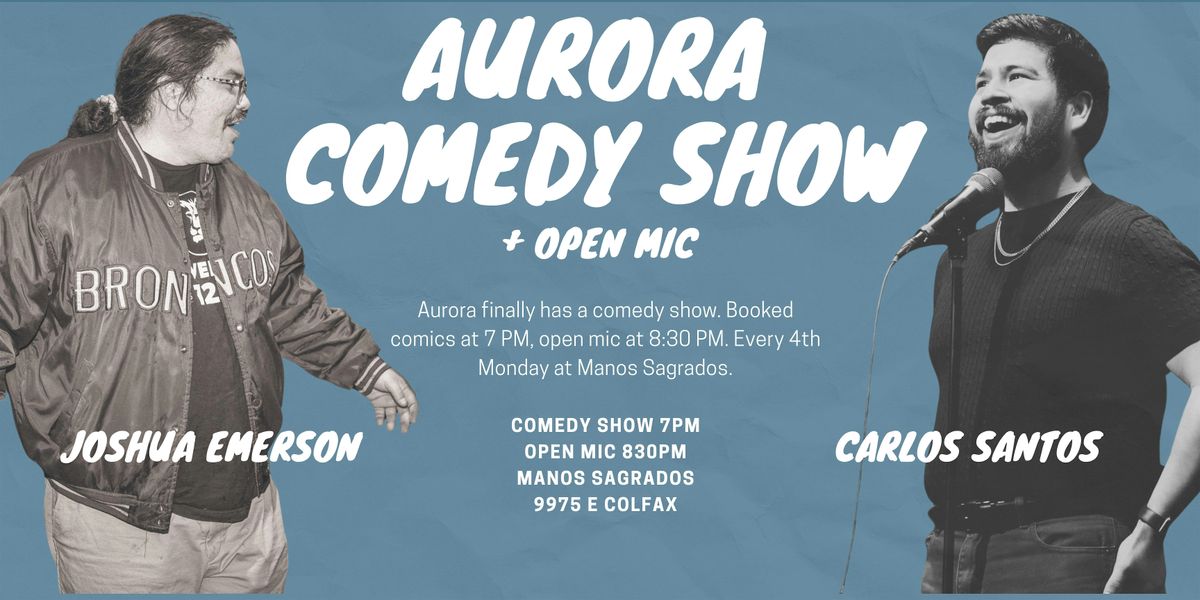 Aurora Comedy Show @ Manos Sagrados is a new monthly stand-up night bringing big laughs to the East Denver Metro. The evening features a booked comedy showcase at 7:00 PM, followed by an open mic at 8:30 PM for anyone ready to jump on stage.