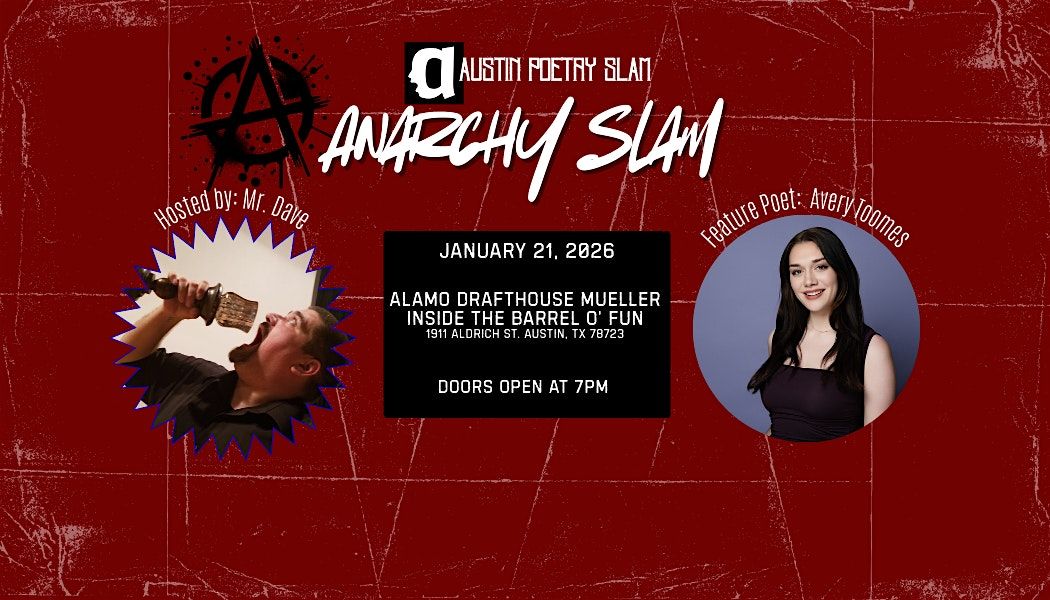 Throw the rulebook out the window. Austin Poetry Slam is back with the Anarchy Slam, a night where the traditional constraints of performance poetry disappear, and chaos takes center stage. Hosted by the legendary Mr. Dave, this is not your average open mic.