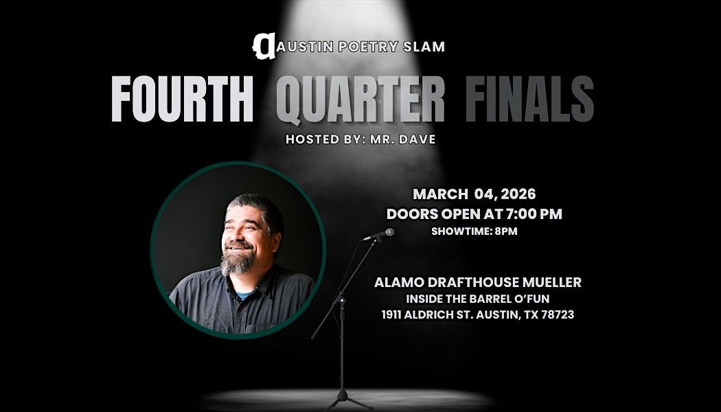 The stakes just hit a new high. On March 04, 2026, the Austin Poetry Slam takes over the Barrel O’ Fun for the 4th Quarter Finals. This is an elite, closed-list competition featuring only the poets who have ground out the points and earned their spot throughout the season.