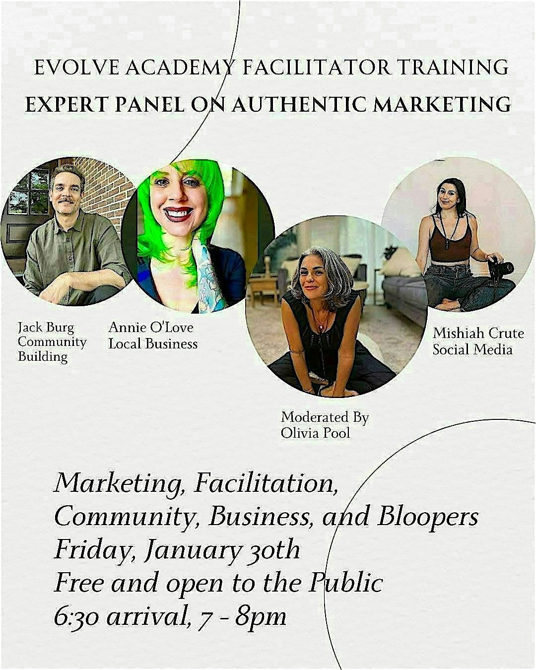 This free Expert Panel on Authentic Marketing is the opening event for the Evolve Facilitator Training, a paid, weekend-long immersion happening Saturday–Sunday, Jan. 31 – Feb. 1.