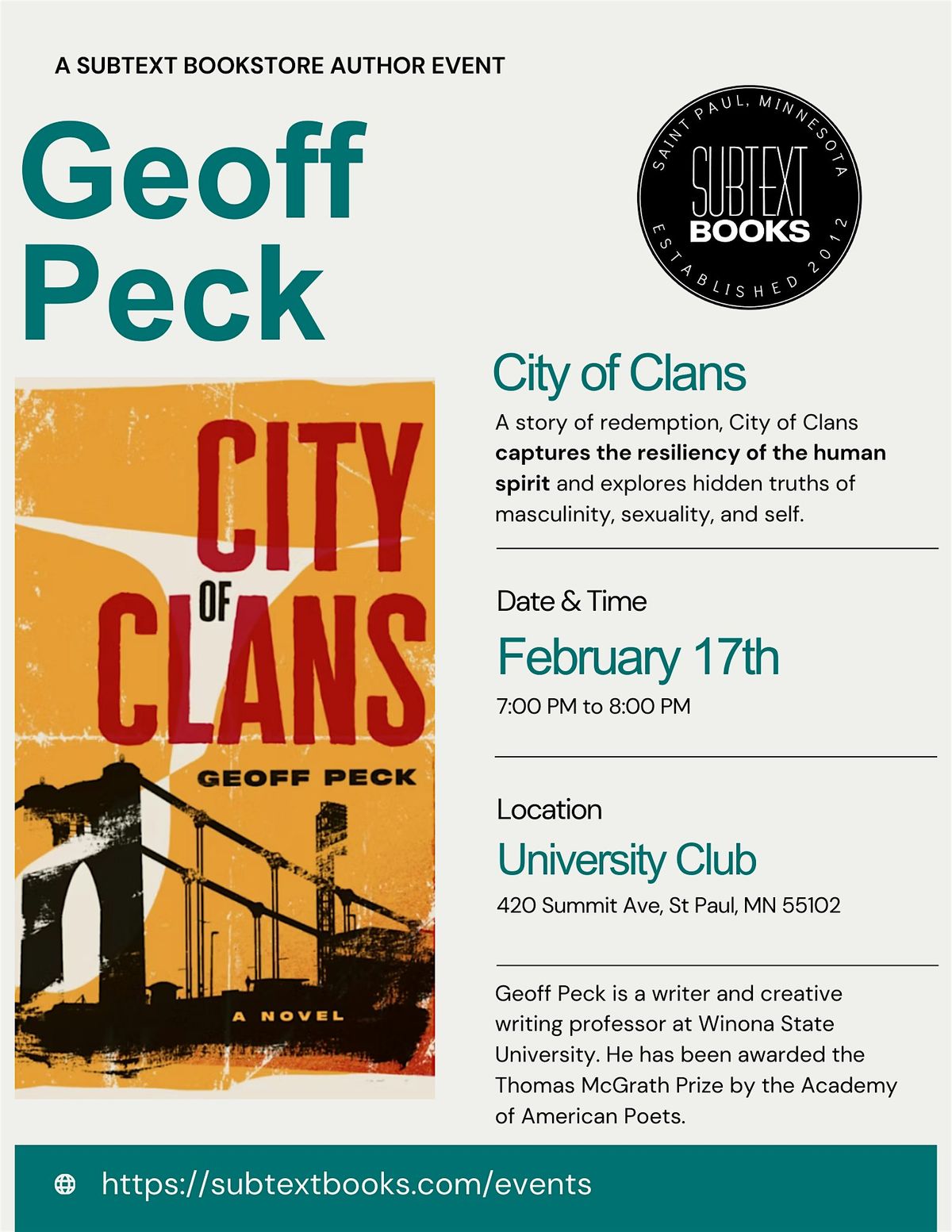 A alcoholic college student discovers his best friend is a sexual predator in Geoff Pecks debut novel, City of Clans.