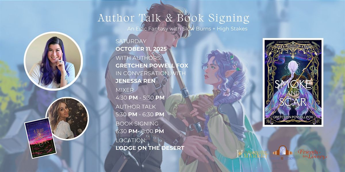 - Q&A with Gretchen Powell Fox featuring Jenessa Ren will begin at 5:30pm, followed by a book signing line where readers can get their copy of Smoke and Scar signed and take a photo with Gretchen.