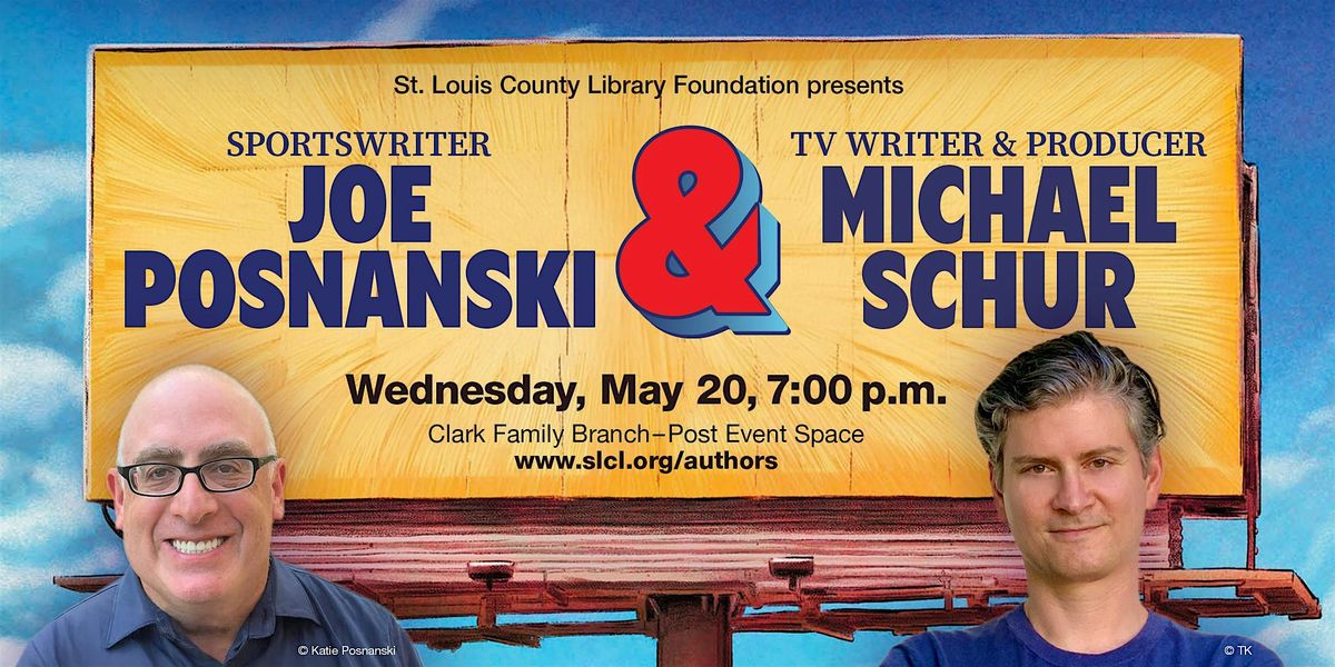 Top image description: Photos of Joe Posnanski and Michael Schur. Text: St. Louis County Library Foundation presents Sportswriter Joe Posnanski and TV Writer and Producer Michael Schur. Wednesday, May 20, 7:00 p.m. Clark Family Branch - Post Event Space. www.slcl.org/authors.