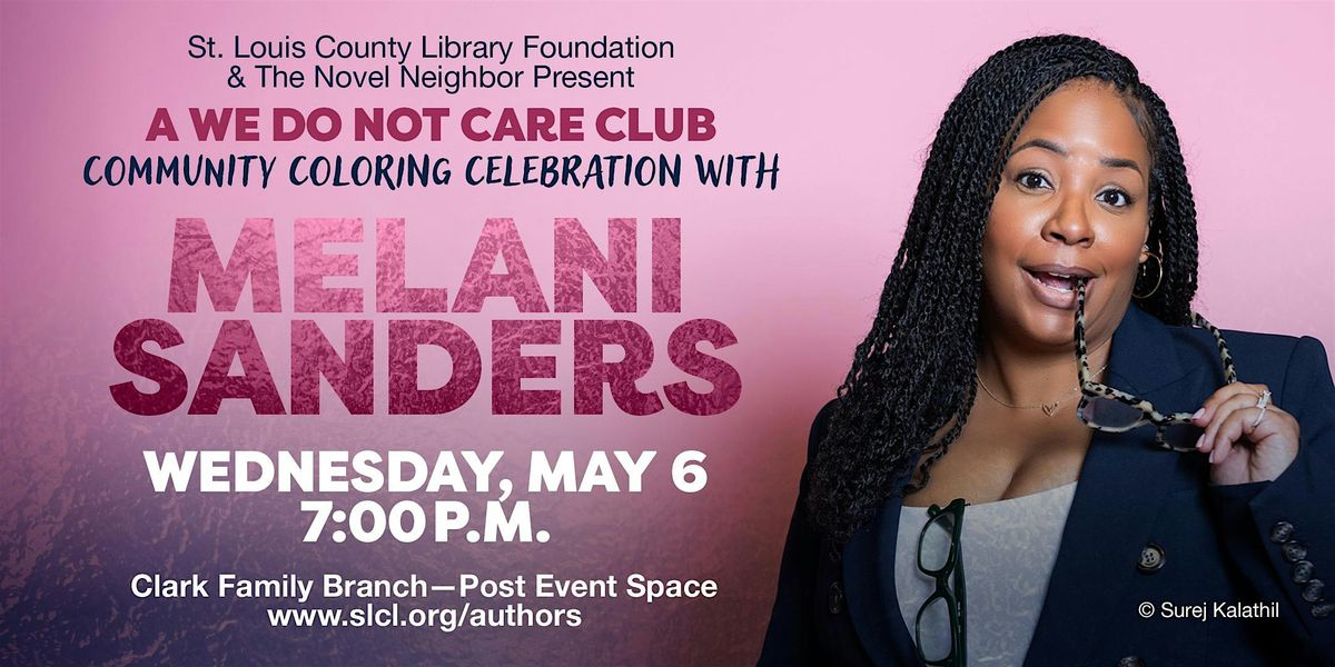 Top image description: Photo of Melani Sanders. Text: St. Louis County Library Foundation and The Novel Neighbor present A We Do Not Care Club Coloring Celebration with Melani Sanders. Wednesday, May 6, 7:00 p.m. Clark Family Branch - Post Event Space. www.slcl.org/authors.