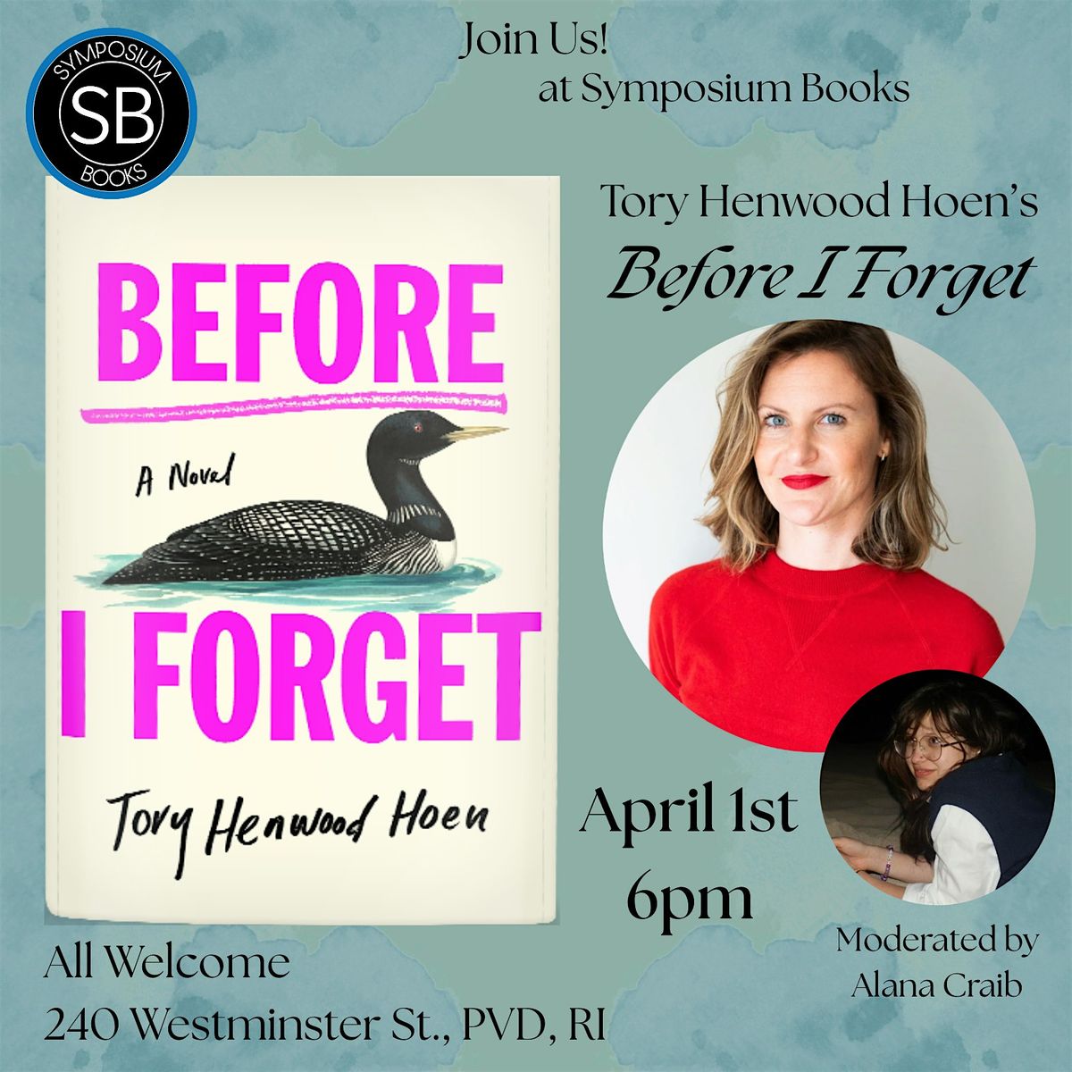 Join us on April 1st at 6pm as we host Tory Henwood Hoen in conversation with Alana Craib to discuss her latest book, Before I Forget: A Novel. Signed copies of the book will be available for purchase!