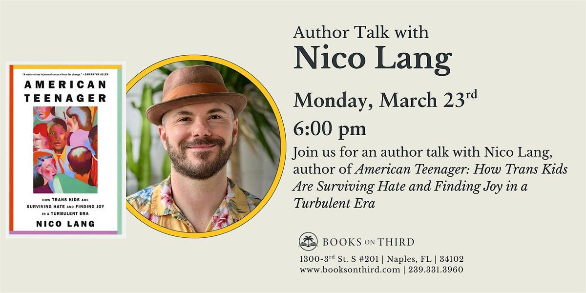 We are thrilled to welcome Nico Lang, award-winning journalist and author of American Teenager, for a special free author talk on Monday, March 23rd at 6:00 PM!