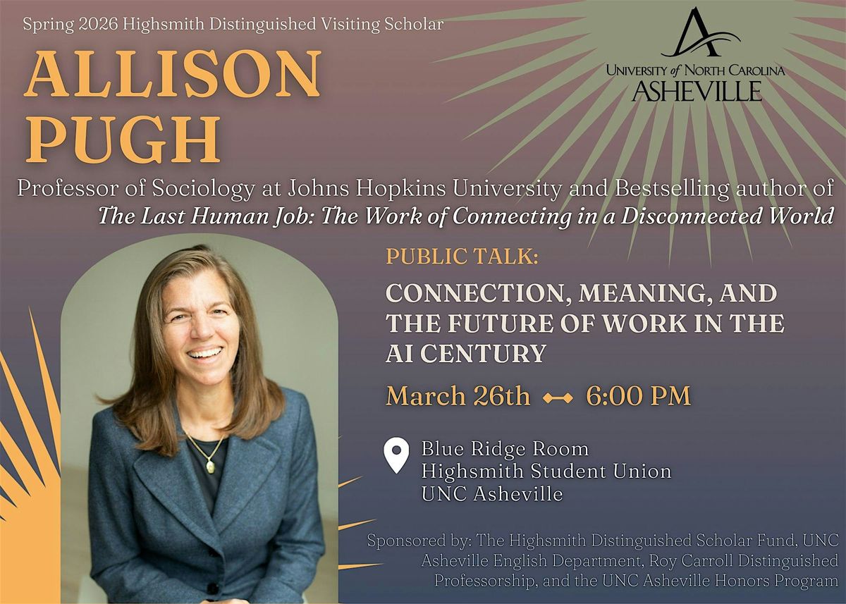 We invite you to join us on March 26th, at 6pm, in the Blue Ridge Room in Highsmith Student Union for a public talk from our Spring 2026 Highsmith Distinguished Visiting Scholar, Author Allison Pugh. Dr. Pugh is a Professor of Sociology at Johns Hopkins University and Bestselling author of The Last Human Job: The Work of Connecting in a Disconnected World.