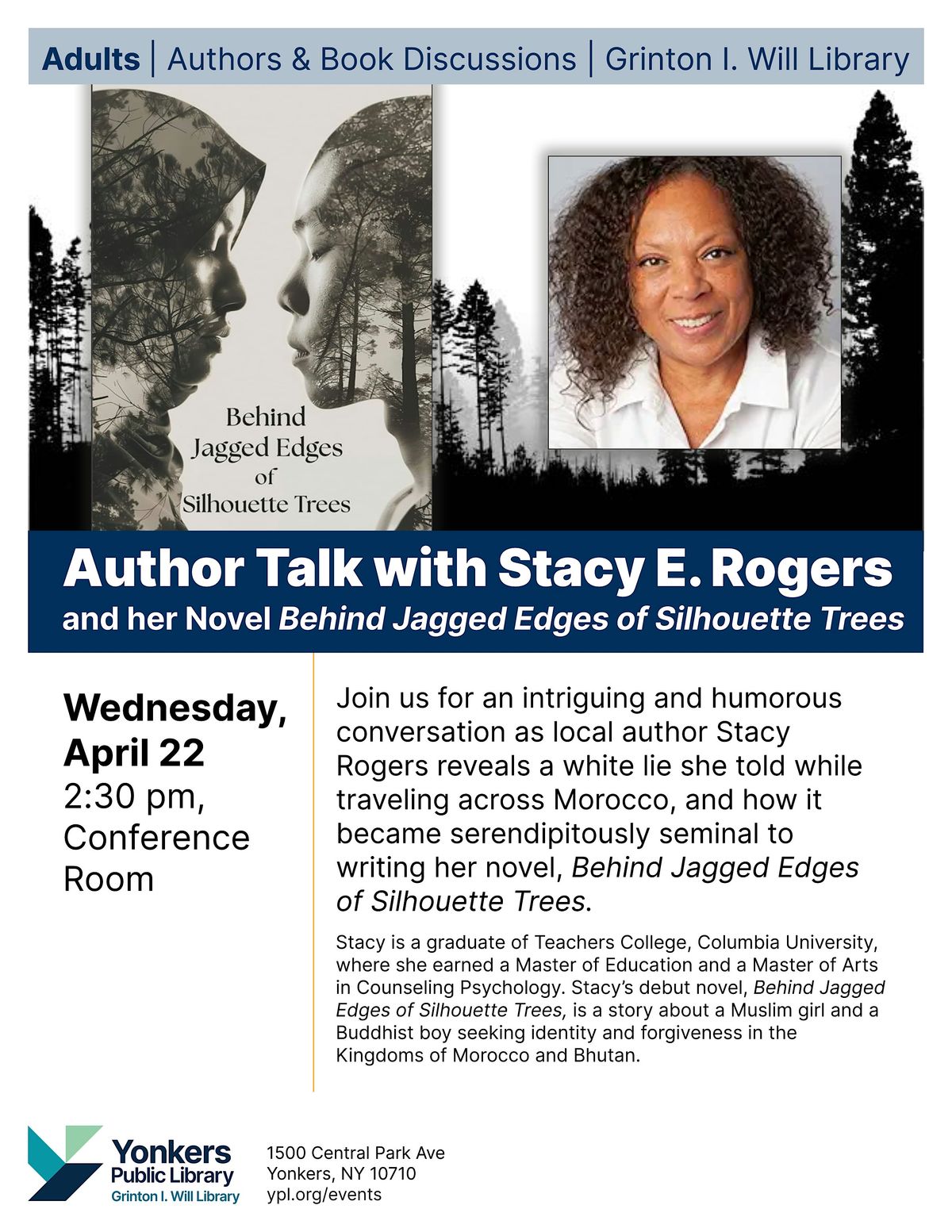 Join us for an intriguing and humorous conversation as local author Stacy Rogers reveals a white lie she told while traveling across Morocco, and how it became serendipitously seminal to writing her novel, Behind Jagged Edges of Silhouette Trees.