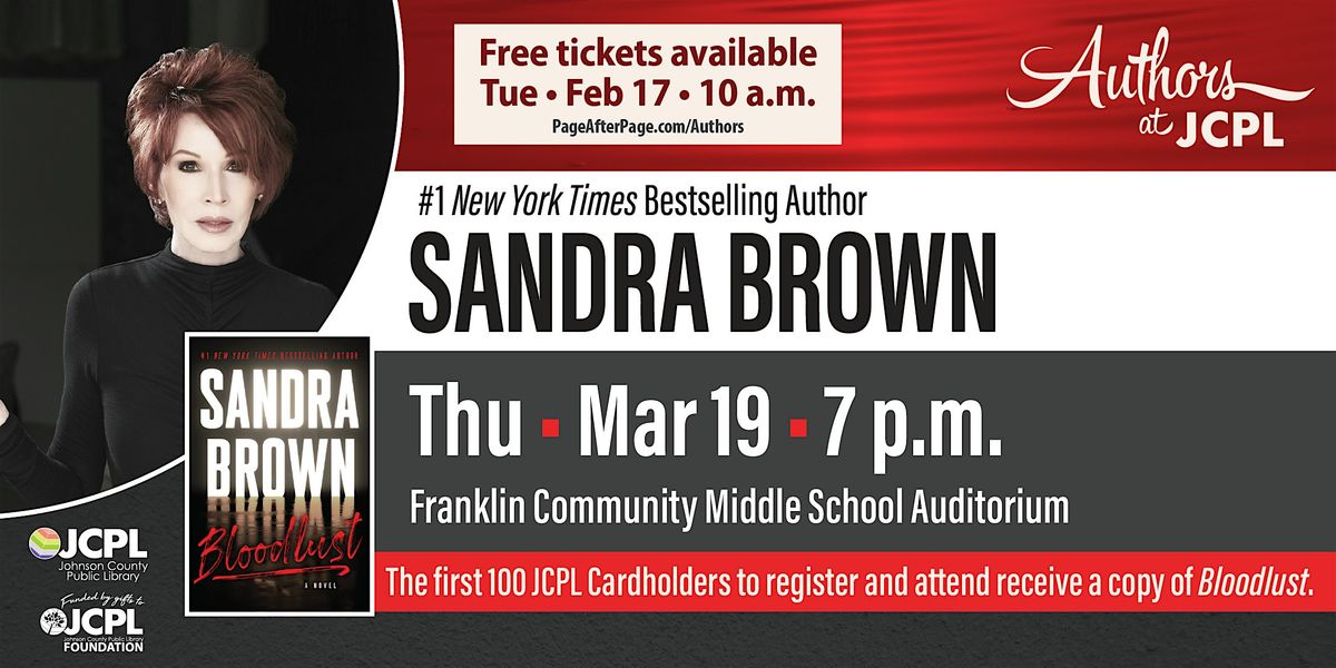 JCPL welcomes the #1 New York Times bestselling author Sandra Brown to Authors at JCPL! The first 100 JCPL cardholders to register and attend will receive a free copy of Bloodlust. Please, only one free book per library cardholder. Reciprocal Borrowers are not eligible for the free book. General admission tickets may be reserved by anyone; you do not need a library card to attend. Copies of the author's books will also be available for purchase through Wild Geese Bookshop.