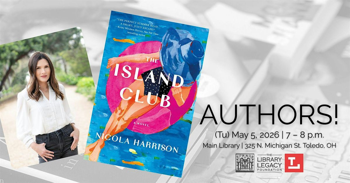 Hailed for her "cinematic and glamourous" historical fiction, bestseller Nicola Harrison joins Authors! to discuss her latest novel, The Island Club.Harrison captivates readers with her deeply researched stories of women navigating pivotal moments in American history. Peek behind the scenes of Harrison's writing process and learn more about her emergence as a prominent voice in contemporary historical fiction. This event features a 45 minute presentation followed by a brief audience Q&A. Each ticket includes a copy of the book.