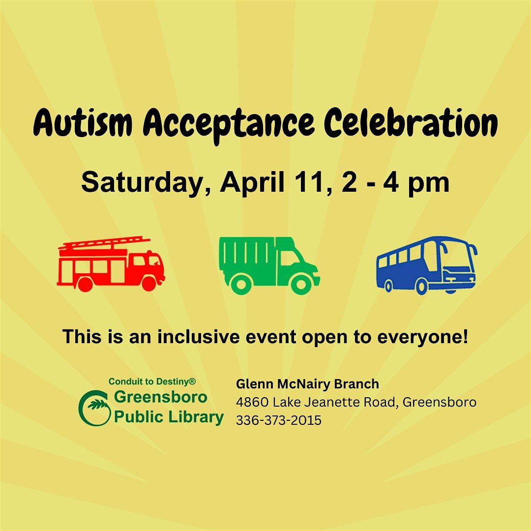Celebrate Autism Acceptance Month at the Glenn McNairy Branch library! At this inclusive event for all ages, you can visit City of Greensboro vehicles in the library parking lot, including a fire truck, police car, recycling truck, and the EcoBus. You can also enjoy sensory activities and learn about autism resources in the community. Meet representatives from The Arc of Greensboro, Autism Society of North Carolina Guilford County Chapter, Autism Unbound, City of Greensboro Parks and Recreation Adaptive and Inclusive Recreation, Guilford County Schools Exceptional Children, Legs Financial, Special Olympics Guilford County, and more. If you have questions, please call the Glenn McNairy Branch at 336-373-2015.