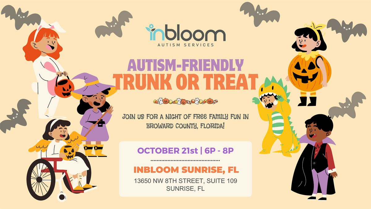 Join us at InBloom Autism Services | Sunrise for a special family event tailored for young kids with sensory sensitivities and autism. Our Autism Friendly Trunk or Treat will feature a safe and inclusive environment for children to enjoy Halloween festivities with treats and activities. We'll also have a variety of Autism Resources available for families in the area.