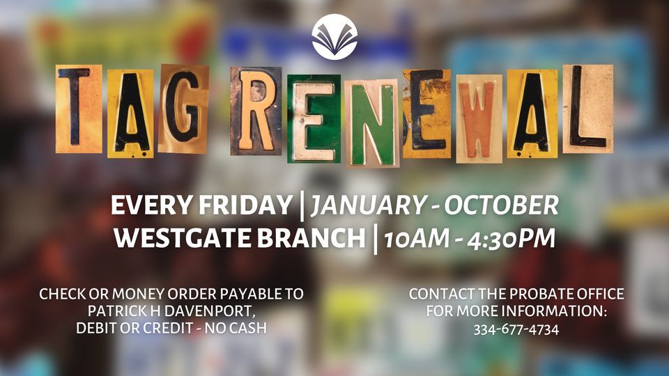 Houston County Probate Office Auto Tag Renewals - Every Friday, 10:00 a.m.-4:30 p.m. at Westgate Library (January—October only). Check or Money Order (Payable to Patrick H. Davenport), Debit or Credit. No Cash. For additional information please call the Probate Office at 334.677.4734 *Please note: The end of the month is especially busy. Please plan accordingly.