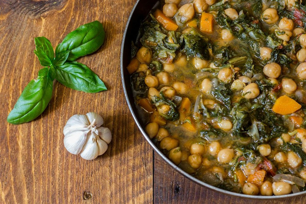 Cacciucco Di Ceci - A rustic chickpea stew simmered with onion, garlic, greens and tomatoes it's the kind of dish that feels like a warm hug in a bowl.