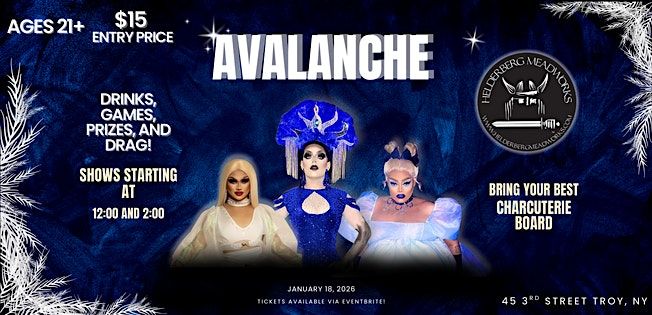 Get ready to party with queens Philly Pina, Gemini DaBarbay, Regina Sapphire, and Andramada from North Adams, MA! There will be drinks to purchase, games, drag performances, and a charcuterie board contest! Prizes for best board include 2 tickets to a future show and a bottle of mead provided by Helderberg Meadworks!