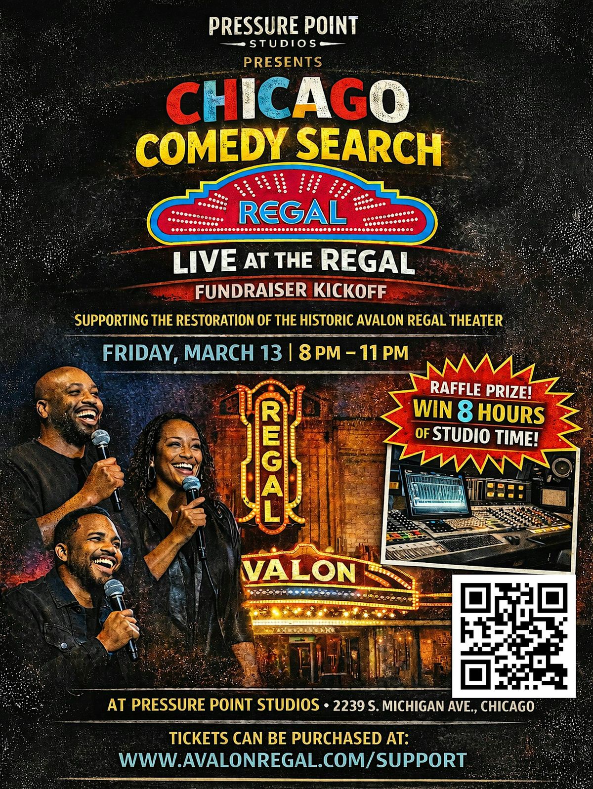 Join us for an unforgettable night of laughter, culture, and purpose as we officially kick off the Chicago Comedy Search while raising critical awareness and support for the restoration of the historic Avalon Regal Theater — a South Shore landmark that helped shape Black American entertainment history.