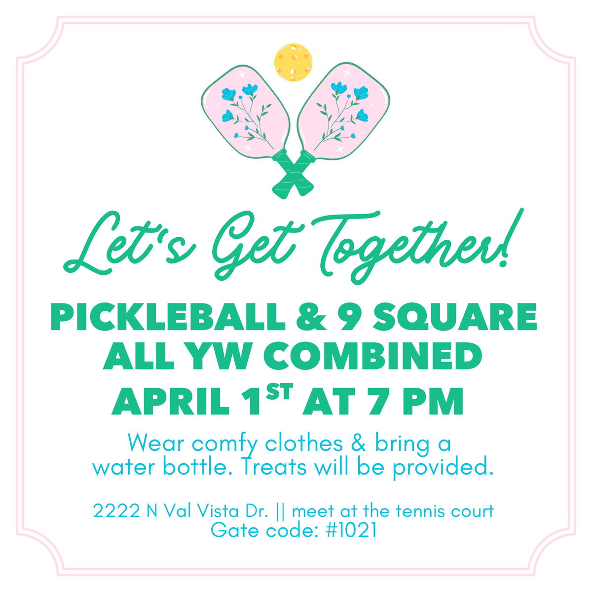 Let's Get together! Pickleball 9 Square for all young women. Meet at 2222 N Val Vista Drive, Gate Code #1021. Please meet at the tennis court. Wear comfy clothes and bring a water bottle. Treats will be provided.