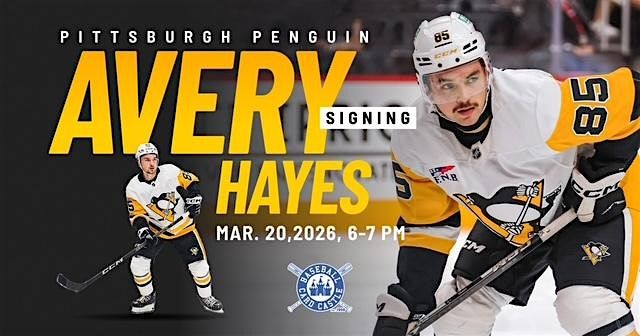 Come meet the Pittsburgh Penguin Avery Hayes at Baseball Card Castle for an exclusive autograph session! Get your favorite memorabilia signed and take a photo with him!
