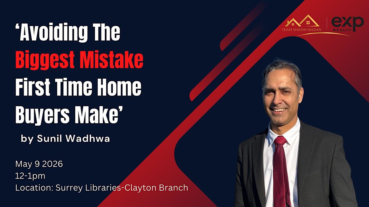 Join us at Surrey Libraries – Clayton Branch on May 9, 2026 at 12:00 PM (Pacific Time) for a casual and helpful session. We’ll dive into the most common mistakes first-time buyers often make and how you can easily avoid them. Whether you're just starting out or need a quick refresher, this event is perfect for building confidence in your buying journey. Don’t miss out on tips and friendly advice that could save you time and money!