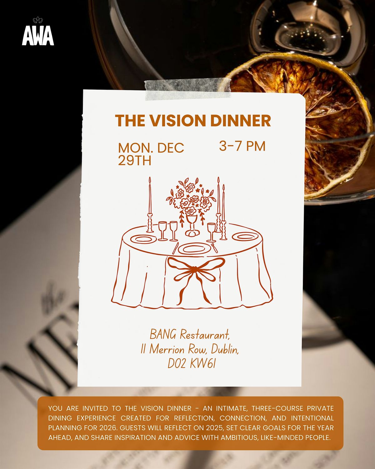 The Vision Dinner is a three-course private dining experience hosted by AWA right here in Dublin. Expect great food, inspiring conversations, and amazing company. It's the perfect chance to connect, share ideas, and dream big with other like-minded young people.