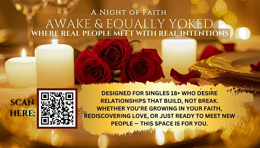 Awake and Equally Yoked is a Christ-centered experience for Christian singles 18+ who are ready to connect with purpose and have a great time doing it! Rooted in faith, this uplifting gathering creates a welcoming, joyful atmosphere where like-minded believers can meet, laugh, fellowship, and grow together.