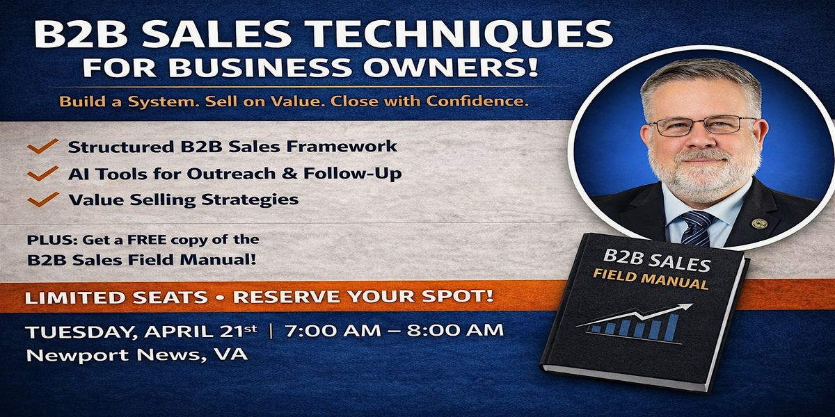 Join us for a hands-on session at 733 Thimble Shoals Blvd, in Newport News, VA. Whether you're new to B2B sales or looking to sharpen your skills, this event will give you practical tips and tricks to boost your business. Don't miss out on learning how to connect better with other businesses and close more deals in a friendly, relaxed setting!