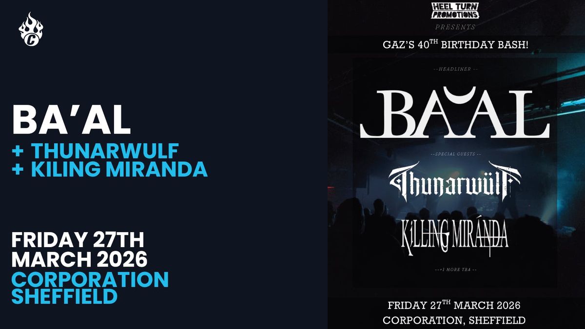 Heel Turn Promotions & Corporation presents Gaz's 40th birthday bash, featuring Ba'al!Heel Turn are celebrating Gaz's milestone birthday in the only way they know how - putting on a show at Corp!Headlining the evening are local blackened post metallers Ba'al. Simply, they are one of the premier bands the city has to offer, combining complex, heavy riffs with emotive, thought-provoking lyrics to create an unmatchable, moving show.Special guests come in the form of folk metallers troubadours (and Metal 2 the Masses Sheffield 2025 Winners) Thunarwulf and goth metal icons Killing Miranda. Specially hand-picked openers will be revealed in due course.It's on Friday 27th March 2026, and it's £8 advance / £10 on the door.Disclaimer: