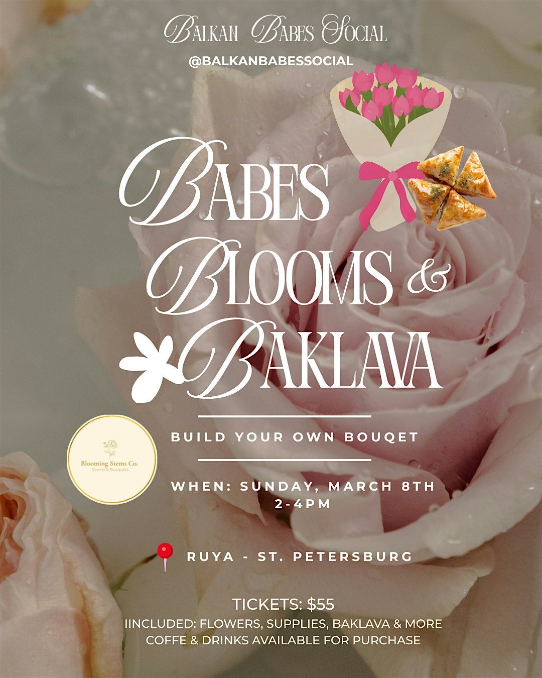 Included: Flowers and supplies from Blooming Stems Co, journaling materials, baklava, 1 speciality coffee or matcha, and more!