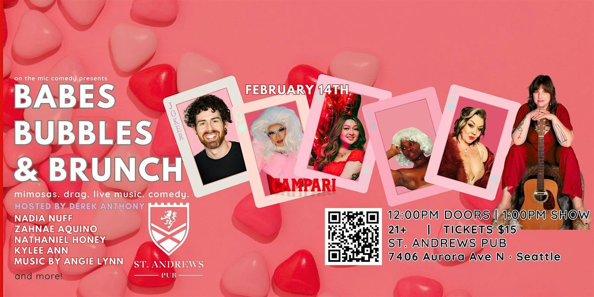 Come join us for a fabulous start to Valentines day with delicious food, refreshing drinks, and great company. On The Mic Comedy presents the very first Babes, Bubbles & Brunch - a monthly variety show at St Andrews Pub. We'll have featured Campari, Aperol, and Fever Tree offerings as well as a special brunch food menu.