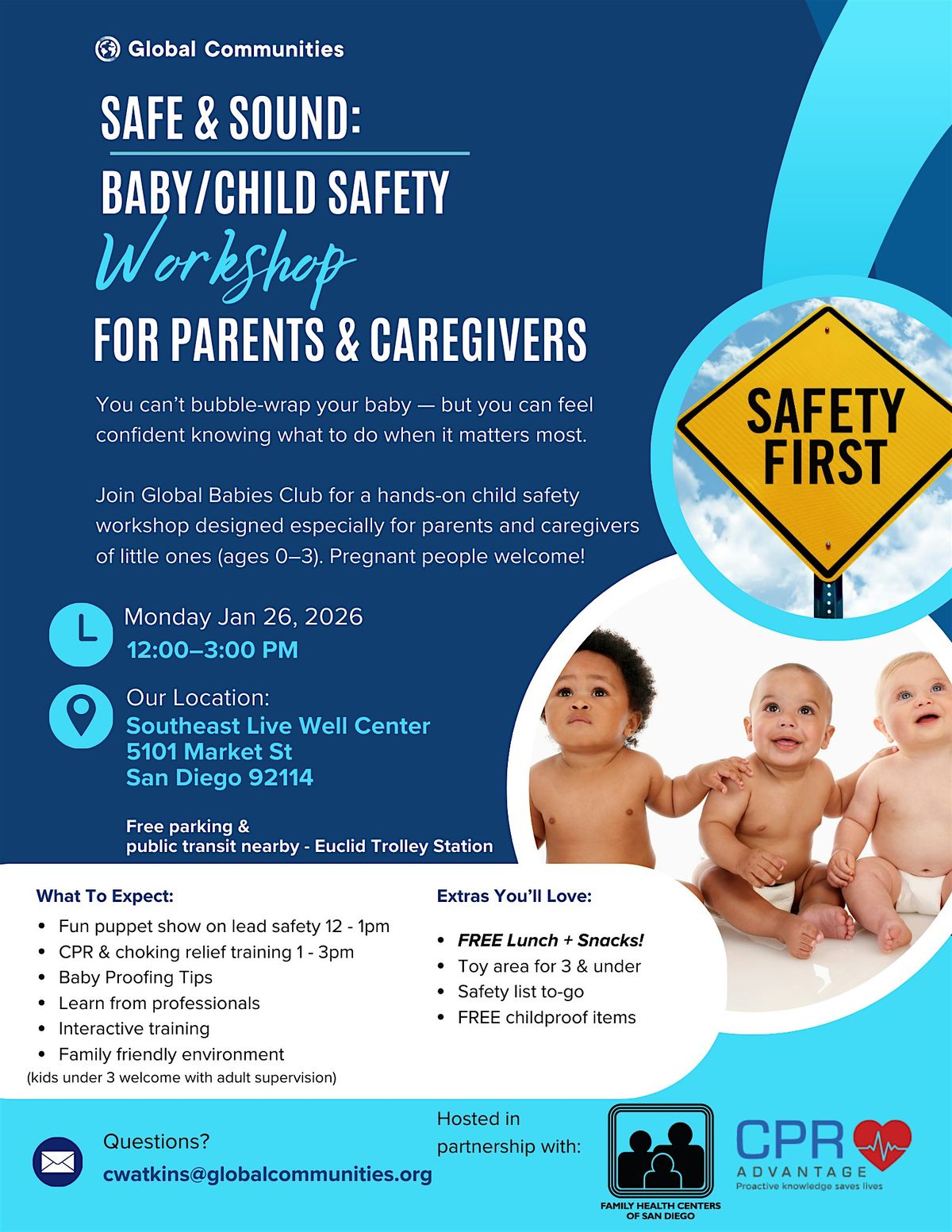 Join Global Babies Club for a hands-on child safety workshop designed especially for parents and caregivers of little ones (ages 0β3). Pregnant people welcome!