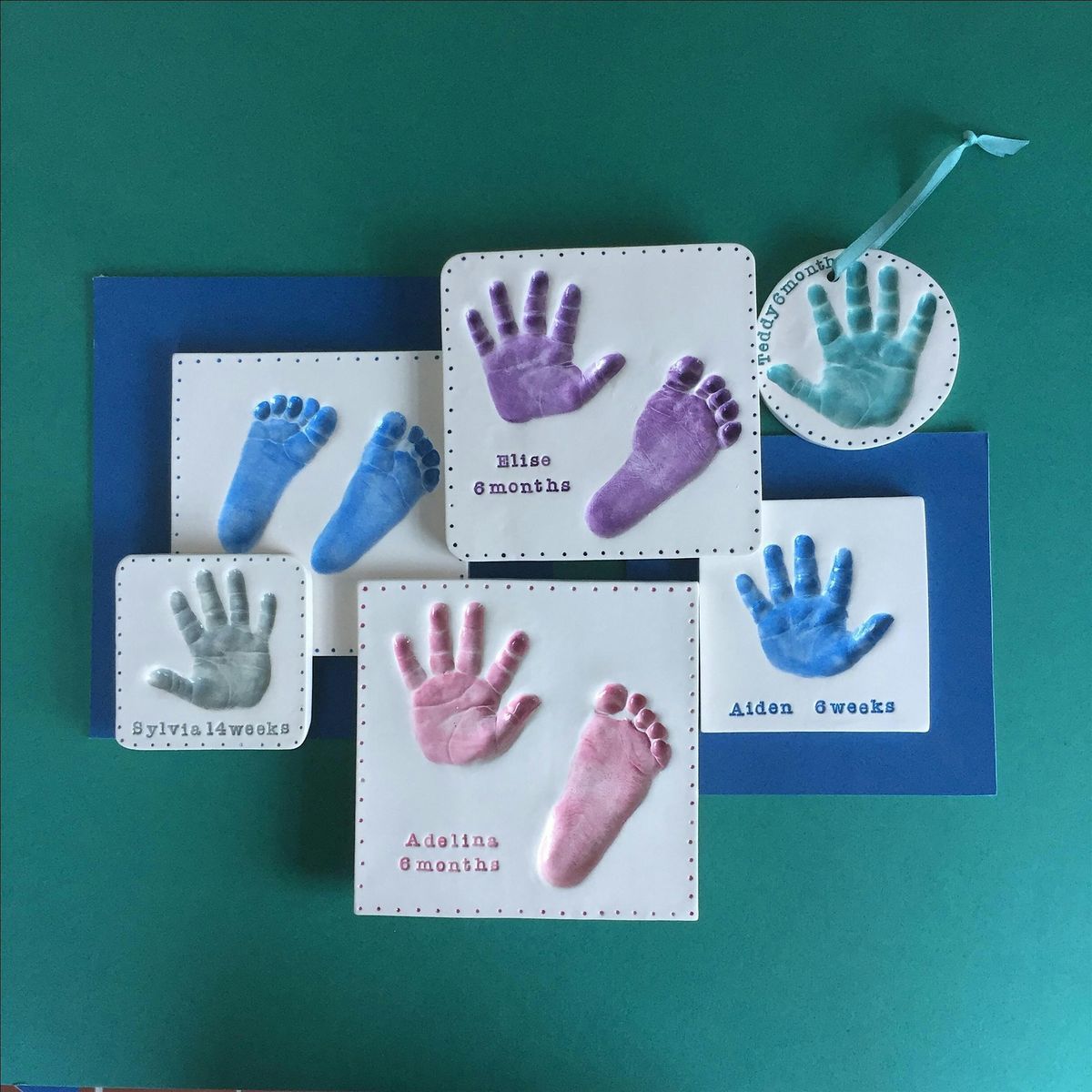 Join us, Poppy Ceramics Mobile Studio, for an imprint session to make clay imprints of your baby's hand and/ or foot. The ticket price includes an unframed square plaque of your baby's hand and print (like the purple and pink prints in the photo) or two single imprints (like the green and grey imprints) with their name and age imprinted into the clay.