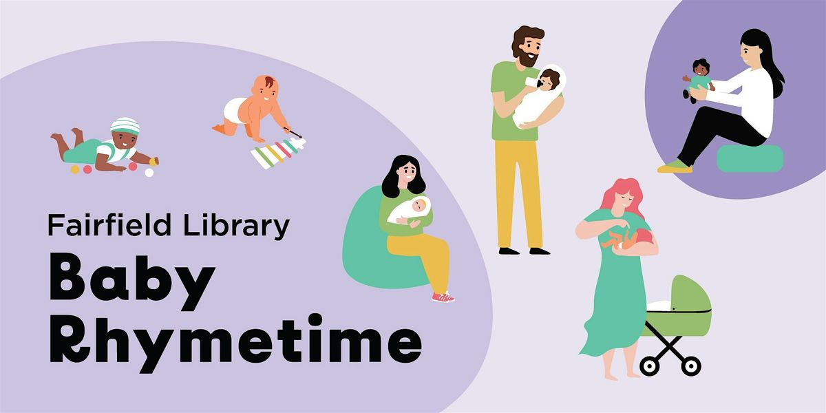 Image: Graphic of adults holding babies in different poses, plus two babies playing on the floor. Text says Fairfield Library Baby Rhyme Time.